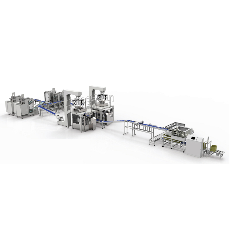 2、生產(chǎn)線配置有立式包裝機(jī)若干臺+小包整理輸送線+斗式提升機(jī)+電腦組合秤+電子稱架
